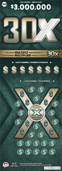 *MULTIPLIER values include 1X, 2X, 3X, 5X, 10X and 30X. MULTIPLIER values are applicable to only those YOUR NUMBERS contained inside the yellow "X" pattern of the ticket. Numbers located outside of the yellow "X" pattern of the ticket are not eligible for any MULTIPLIER. The MULTIPLIER values of 2X, 3X, 5X, 10X are applicable to $30, $50, $100, $150, $250 and $1,000 prize categories only. The 30X MULTIPLIER is applicable to $30, $50, $100, $150, $250, $1,000 and $100,000 prize categories only.