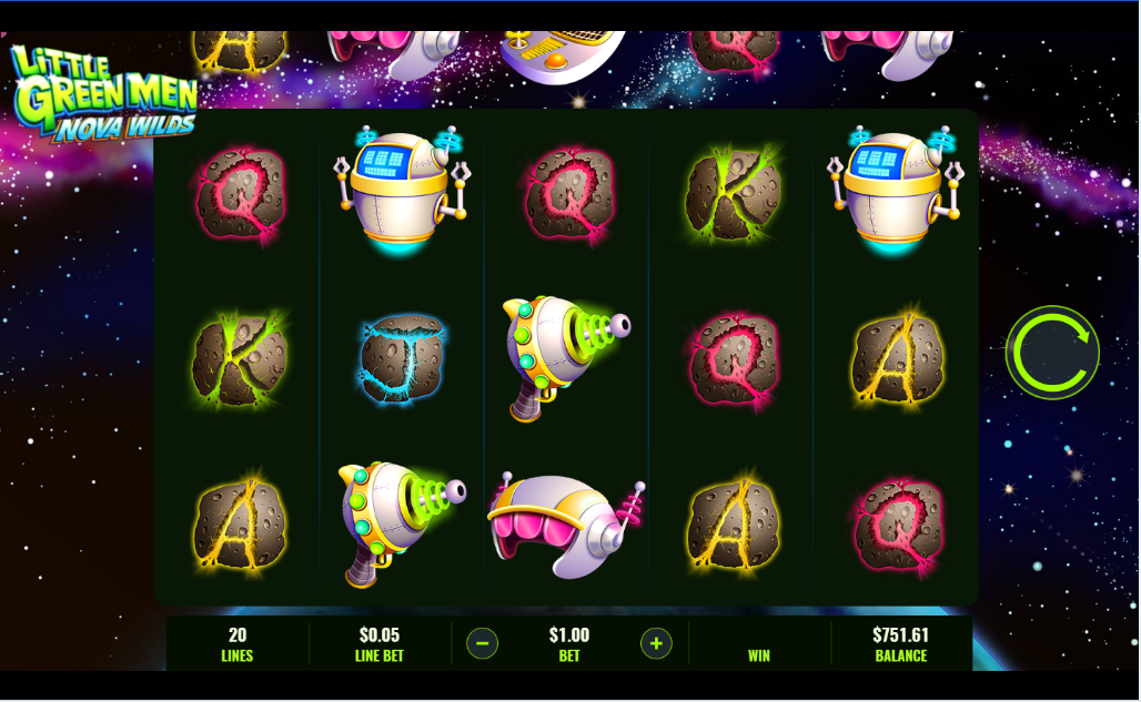 These Little Green Men might appear any spin. Each Little Green Man has a different gadget and is ready to make your wins even more astronomical. These friendly visitors also have a few tricks up the sleeves of their spacesuits: there’s a chance that any modified win could be multiplied, up to 25x! Trigger the Free Spins Bonus and travel through hyperspace to a place where the reels are double-height and the modifying Little Green Men appear much more frequently! It’s intergalactic cooperation at its best in Little Green Men Nova Wilds!