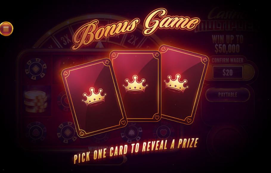Each time PLAY is pressed the Multiplier Wheel at the top of the board will spin before stopping on a multiplier amount or CARD BONUS symbol (see CARD BONUS GAME section below for what happens when wheel stops on CARD BONUS symbol). Once no winning patterns are present, the multiplier amount that the Multiplier Wheel has stopped on gets applied to any wins on the 5x3 board for that round.