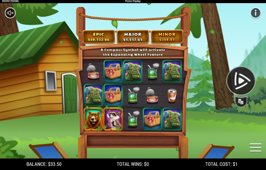 Each Picnic Payday ticket features fifteen (15) symbols on a five-by-three (5x3) game board. Upon purchasing a ticket, new symbols appear from the top of the screen to fill the grid.