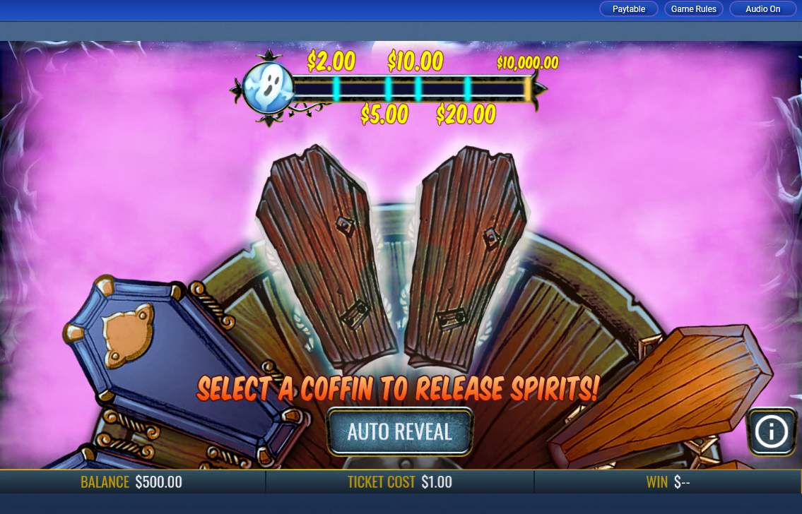 Reveal three Coffin symbols to trigger the Coffin Capers Bonus. The bonus consists of five coffin rounds, each with increasing prize values. Select one of two coffins to reveal spirits. If the number of spirits meets or exceeds the marker on the spirit meter for that round, highlighting the achieved prize, before advanceing to the next round. Each round requires an increasing number of spirits to advance and is dependent on the prize offered. Continue advancing to the next round until the required number of spirits for the current round is not collected, or the fifth round's prize is awarded.