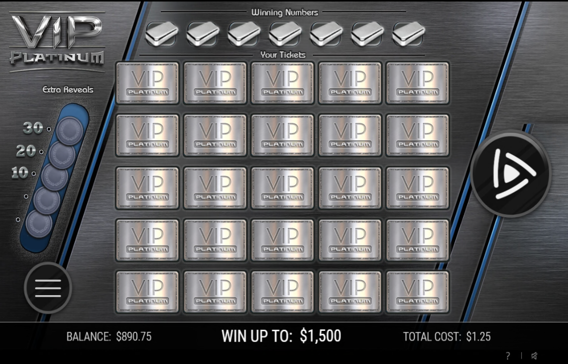 Each VIP Platinum game features 7 Winning Numbers, up to 25 Your Tickets, and an area for collecting Platinum Coins.